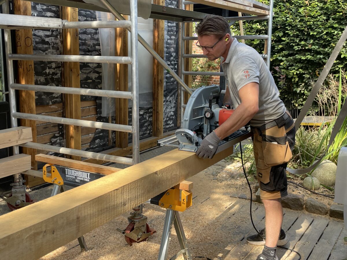 Jeg kører helt old school og lægger meget vægt på håndværktøjet: stemmejern, stikøkser, høvle, knipler mv. som bruges til at forme og give overfladen og samlingerne karakter. Af og til bruger jeg moderne maskiner fra den tyske producent Mafell. De er særligt nyttige i bindingsværksprojekter som kræver særlige snit og udskæringer. Men maskinerne kan aldrig erstatte håndens finish. Derfor afslutter jeg altid med de gammeldags teknikker: håndhøvling, tilpasning af skrå hageblade, div. låse samt tap og taphuls-samlinger, og efterfølgende slibning og afpudsning, så arbejdet får den rette følelse og holdbarhed.