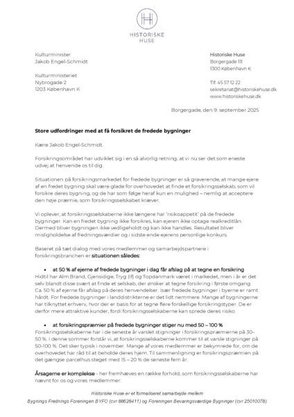 20250909_ Brev fra Historiske Huse til Kulturministeren om forsikring